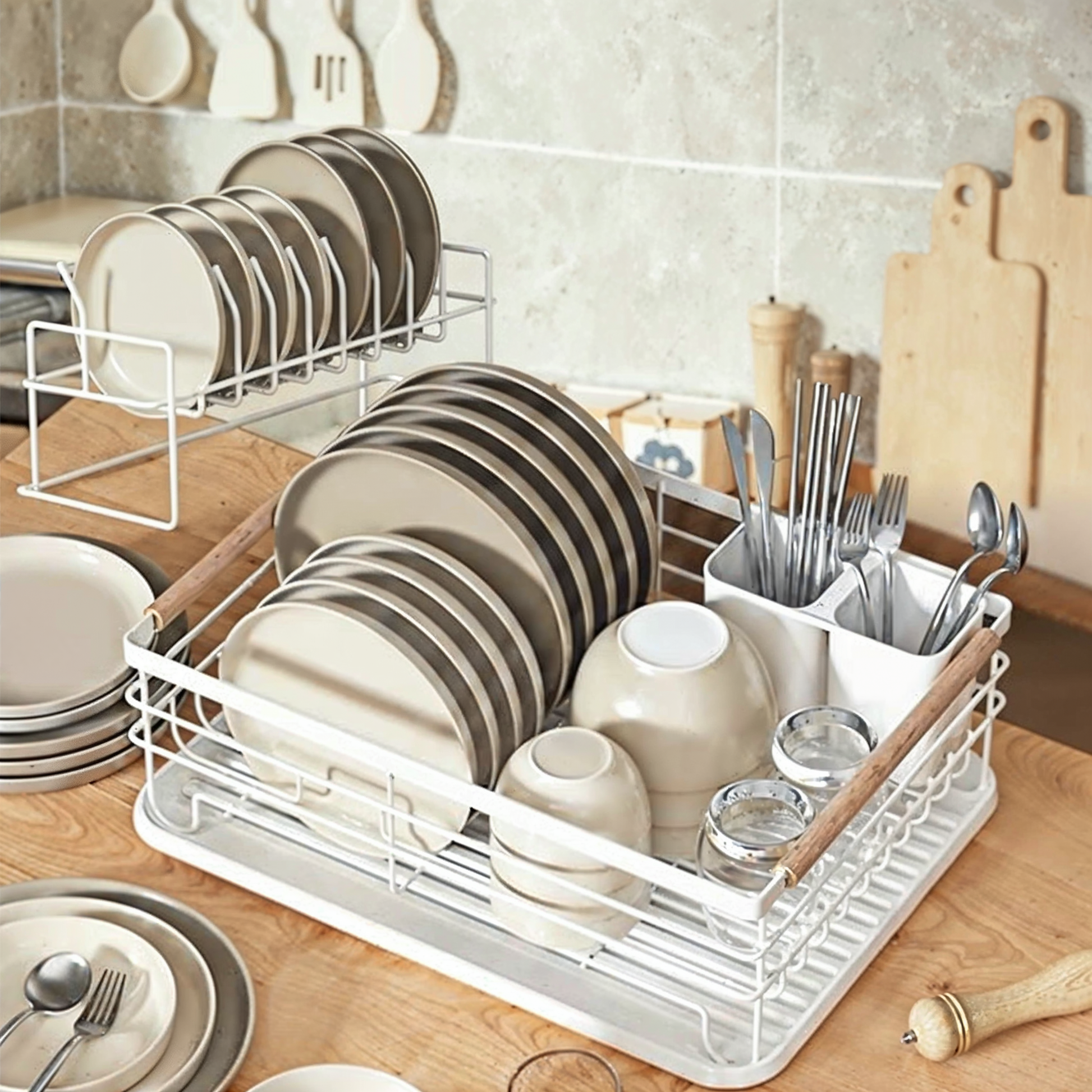 Dish drying rack with wooden handle ,chopstick holder, spoon holder, and water drain tray
