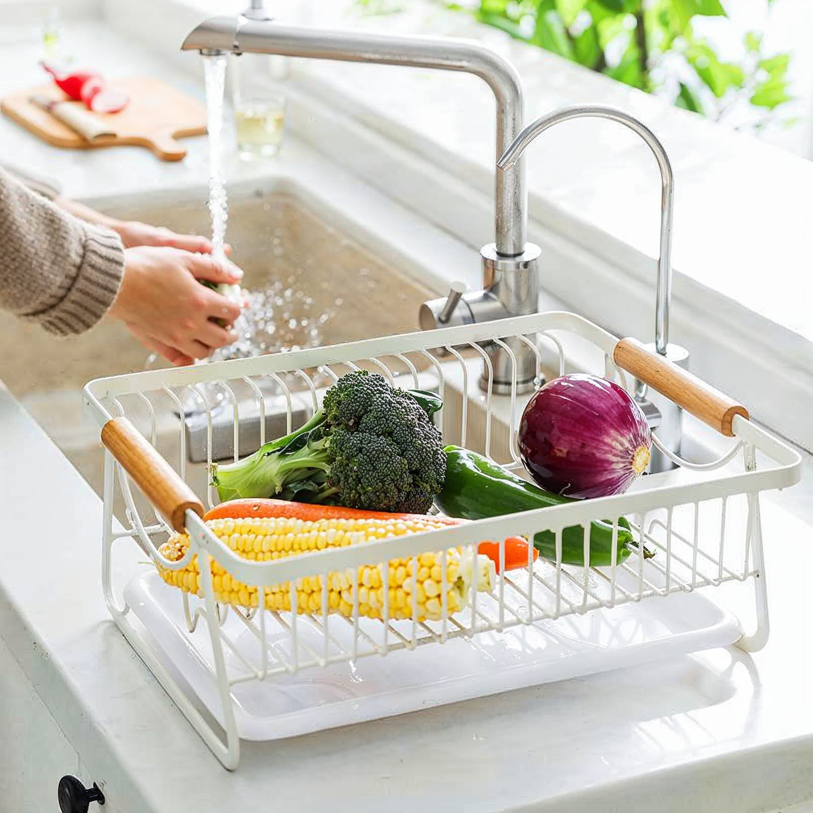 A stylish and practical stainless steel dish rack, perfectly sized for Egyptian kitchens, featuring a plastic drainer and wooden handles for a touch of warmth and